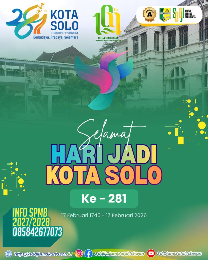 Kebahagiaan ini terasa kian istimewa karena bertepatan dengan Milad ke-104 SD Djama’atul Ichwan (SD DJI). Sejak tahun 1922, SD DJI telah menjadi bagian tak terpisahkan dari sejarah pendidikan di Kota Solo, mencetak generasi yang tidak hanya cerdas secara akademik, tetapi juga bertaqwa dan berbudaya. Angka 104 tahun adalah bukti dedikasi yang tak henti dalam menerangi masa depan anak bangsa di kota bengawan ini.