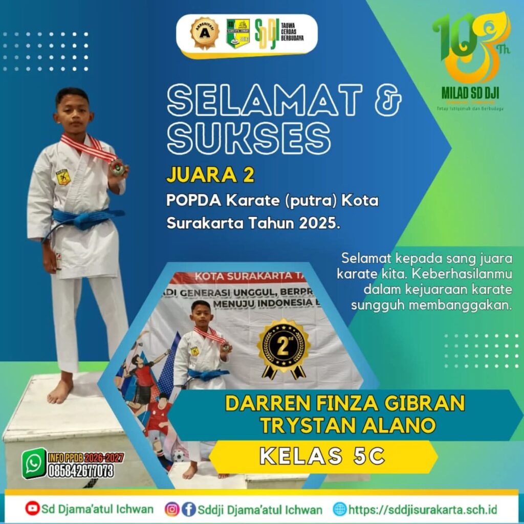 Selamat dan Sukses! Segenap keluarga besar SD Djama’atul Ichwan dengan bangga mengucapkan apresiasi yang setinggi-tingginya kepada ananda DARREN FINZA GIBRAN TRYSTAN ALANO dari Kelas 5C yang telah berjuang keras dan meraih JUARA 2 dalam ajang POPDA Karate (Putra) Kota Surakarta Tahun 2025!