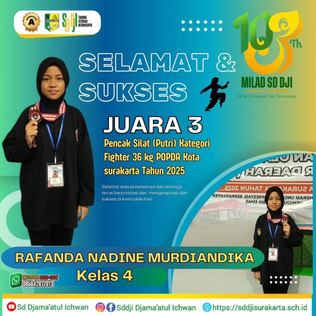 Selamat & Sukses! 🎉 Selamat kepada RAFANDA NADINE MURDIANDIKA, Siswi Kelas 4 SD Djama’atul Ichwan, yang telah meraih JUARA 3 dalam ajang Pencak Silat (Putri) Kategori Fighter 36 kg POPDA Kota Surakarta Tahun 2025.
