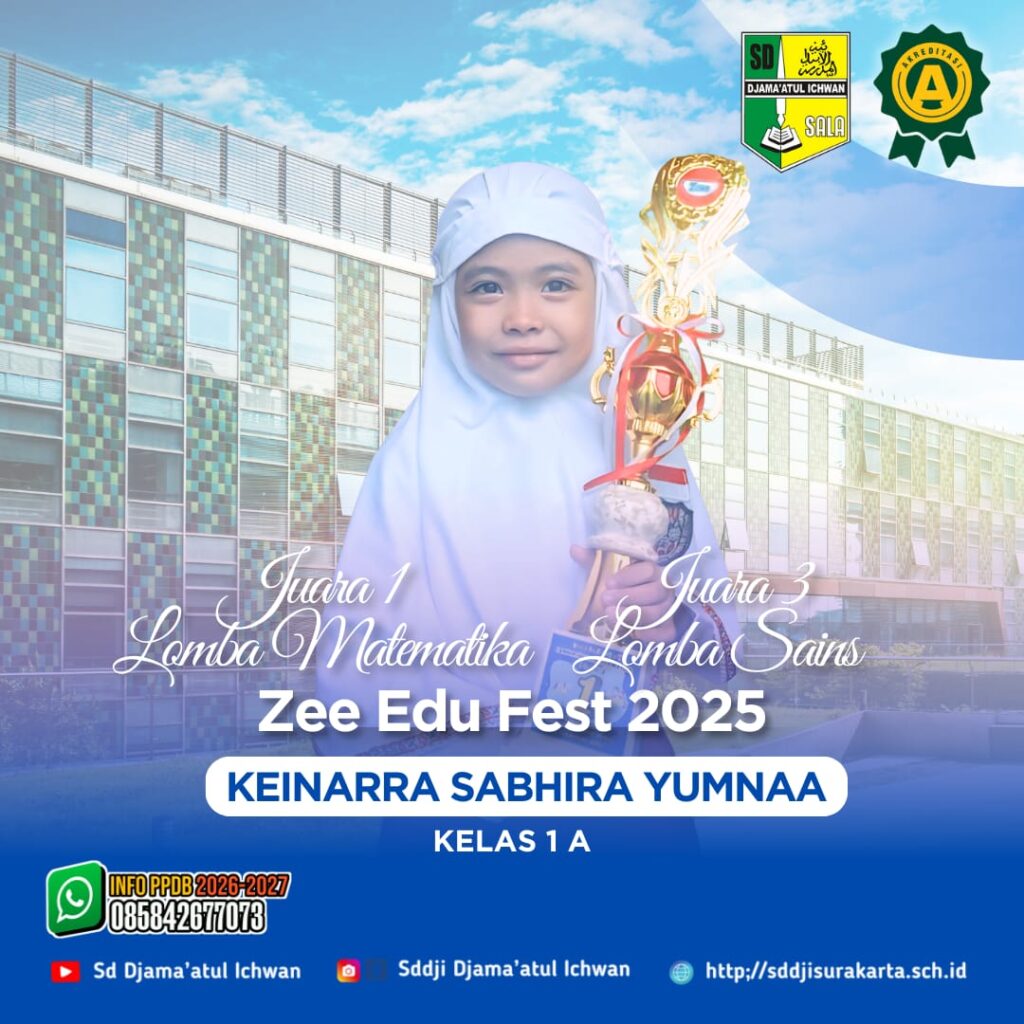 Subhanallah, sungguh prestasi akademik yang sangat luar biasa dari siswa kelas awal kami! Segenap keluarga besar SD Djama’atul Ichwan dengan penuh kebanggaan mengucapkan SELAMAT & SUKSES kepada ananda KEINARRA SABHIRA YUMNAA dari Kelas 1 A atas pencapaian gemilang sebagai Juara 1 Lomba Matematika dan Juara 3 Lomba Sains dalam ajang bergengsi Zee Edu Fest 2025!